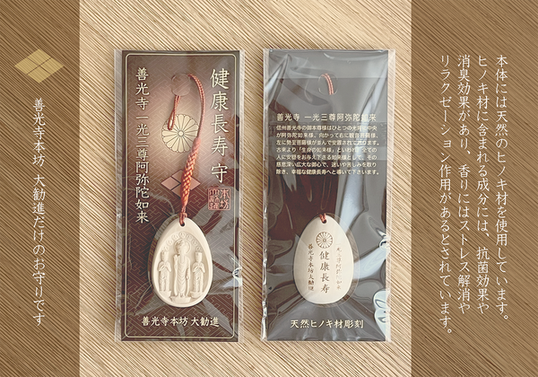 善光寺の御本尊一光三尊阿弥陀如来を天然木で掘った善光寺大勧進だけのお守りです。